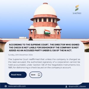 According to the Supreme Court, the director who signed the check is not liable for dishonor if the company is not added as an accused party under S.138 of the Negotiable Instrument Act.